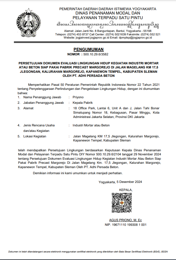 PERSETUJUAN DOKUMEN EVALUASI LINGKUNGAN HIDUP KEGIATAN INDUSTRI MORTAR ATAU BETON SIAP PAKAI PABRIK PRECAST MARGOREJOAdmin DPMPTSP DIY2024-12-09T09:58:18+07:00Kamis, 5 Desember 2024|